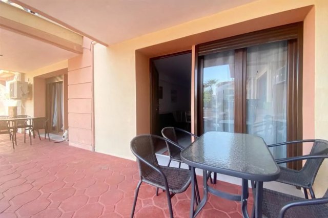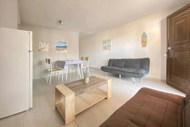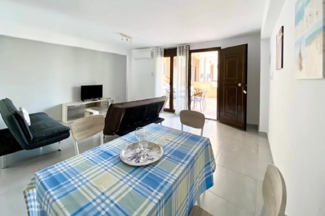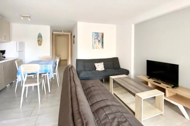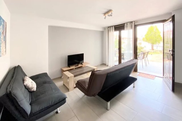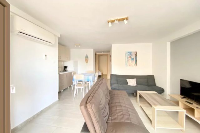 The apartment (60 m²) features an air-conditioned living room with two sofa beds, a first bedroom with a double bed, a second bedroom with two single beds, a fully equipped kitchen, one bathroom, and a terrace with outdoor furniture.