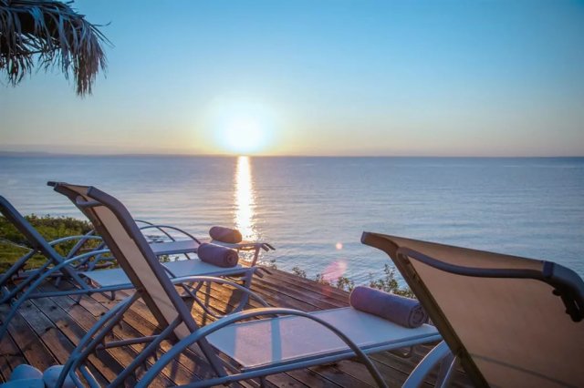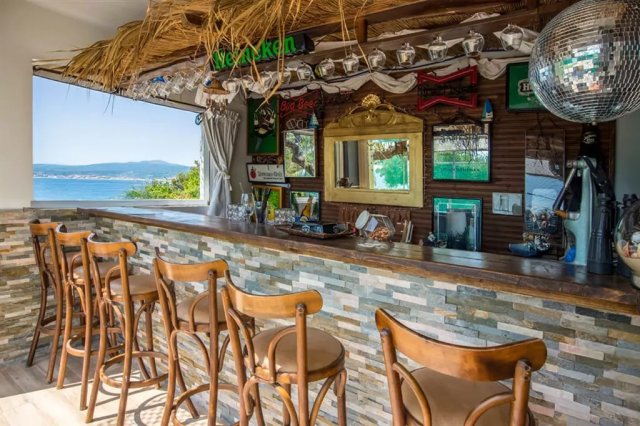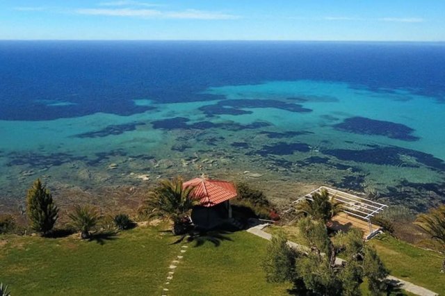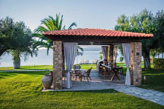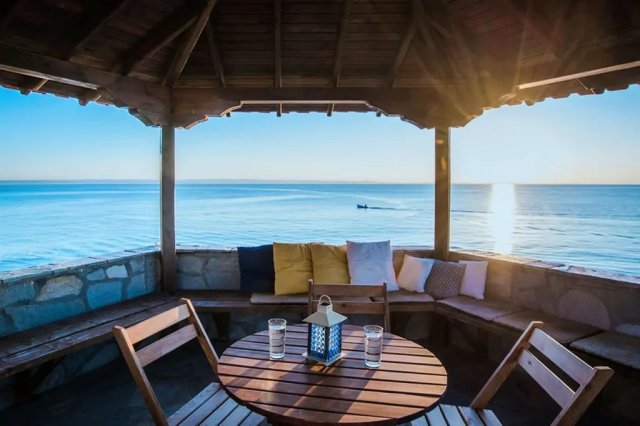This luxury sea view complex includes a carefully arranged yard and a house consisting of two bedrooms, a living room with a kitchen, a bathroom, a toilet, and a terrace with outdoor furniture.