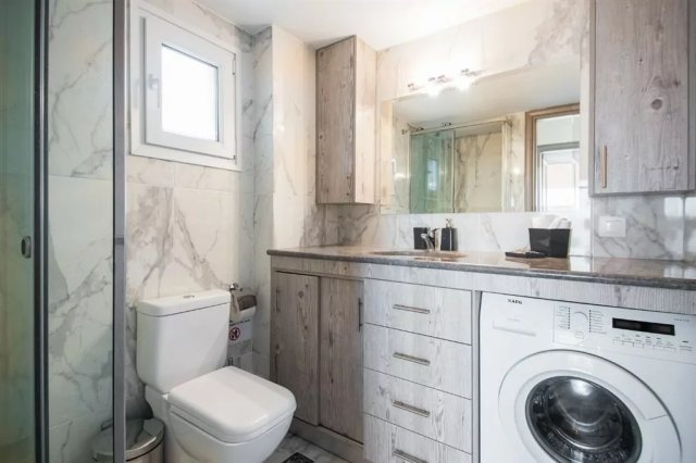 The bathroom is standardly equipped – it includes a shower cabin, a toilet, and a sink. The accommodation also has an additional toilet with a WC and a sink.
