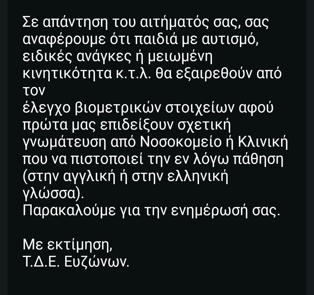 Kako se navodi u odgovoru Policijske uprave Evzoni, deca sa autizmom, posebnim potrebama, kao i osobe sa smanjenom pokretljivošću biće izuzete od uzimanja biometrijskih podataka, odnosno fotografisanja i uzimanja otisaka prstiju na graničnim prelazima sa Grčkom.