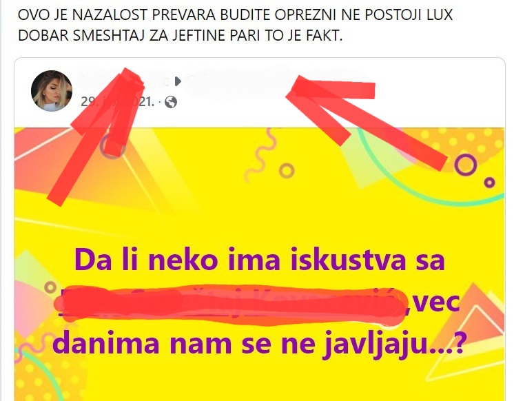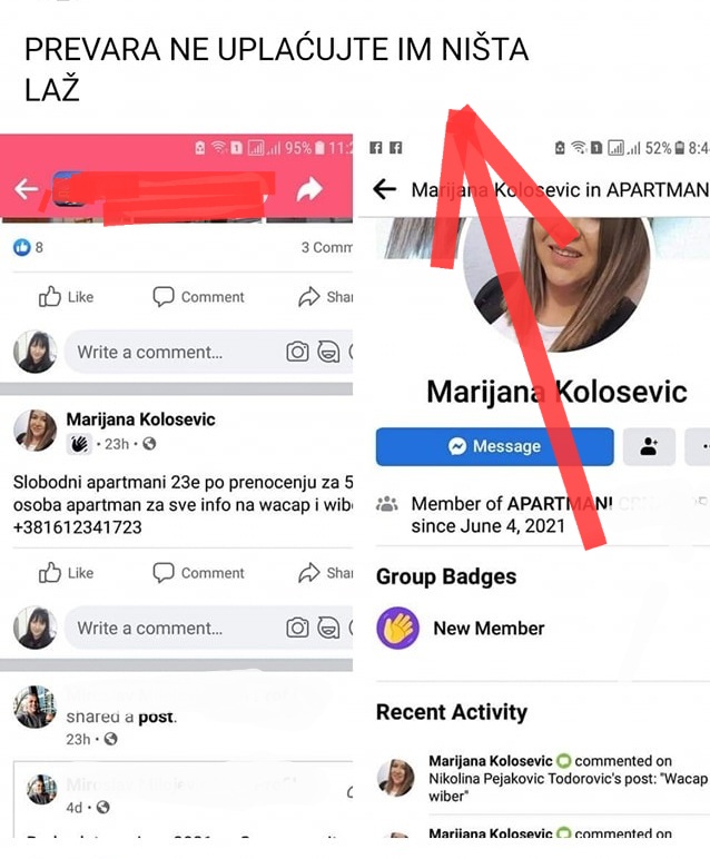 Facebook i slične mreže pune su grupa u kojima se nudi smeštaj u Grčkoj, Crnoj Gori, Hrvatskoj... Mnogi oglasi su legitimni, ali neki nažalost nisu. Profili koji stoje iza njih često nemaju nikakve recenzije, nedavno su otvoreni, a slike su preuzete sa interneta.Zapamtite: činjenica da je neko u istoj grupi kao vi ne znači da je pouzdan.