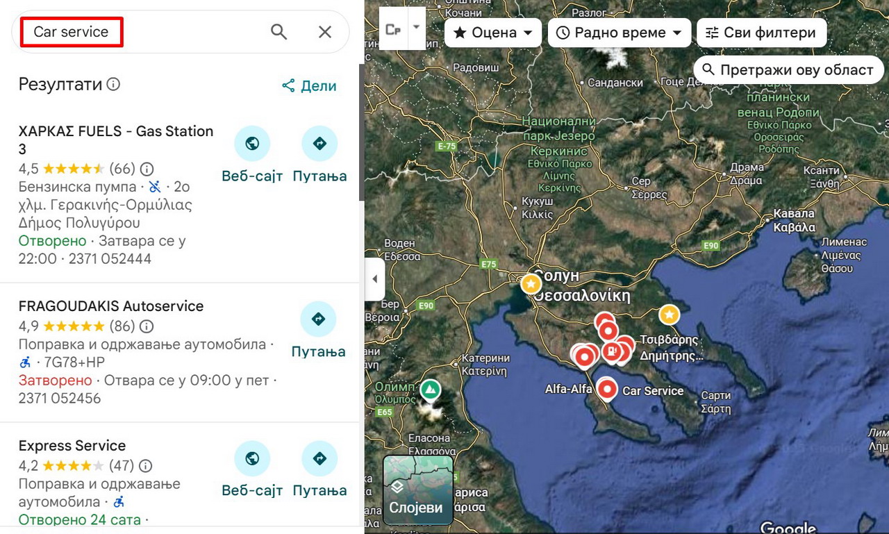 Najbrži i najefikasniji način da pronađete servis jeste putem Google Maps aplikacije na telefonu, koju većina nas već koristi svakodnevno za navigaciju i pretragu lokacija.U pretragu jednostavno unesite ključne pojmove na engleskom jeziku: