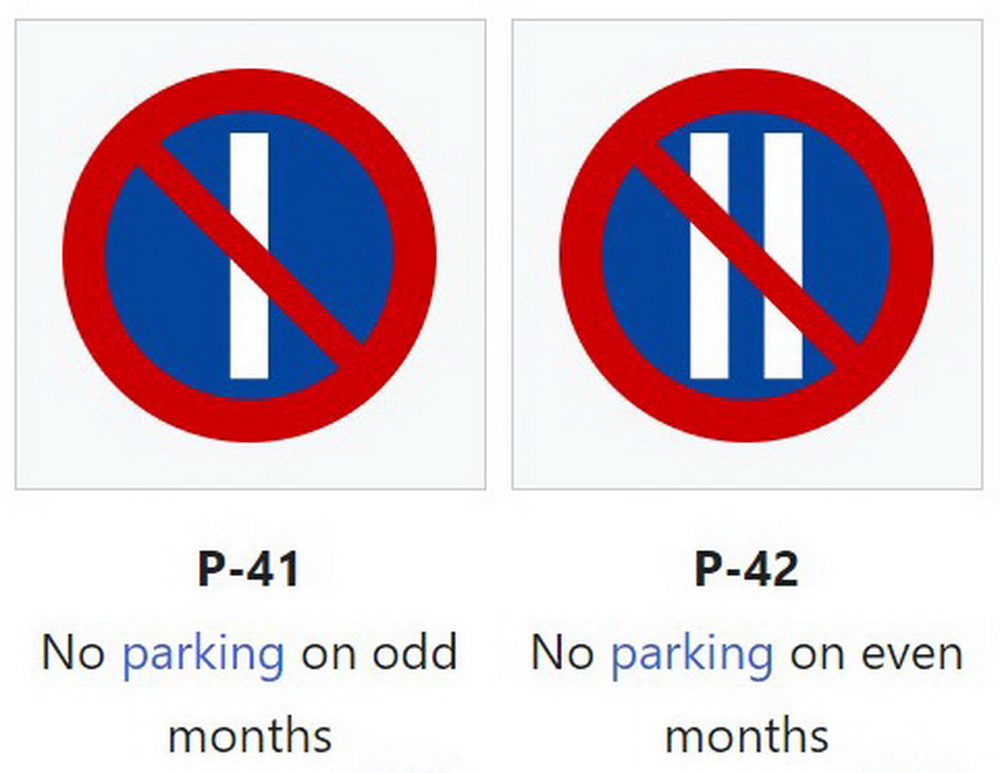 Nasuprot tome, znak sa dve uspravne linije u sredini zabranjuje zaustavljanje i parkiranje u parnim mesecima, odnosno februaru, aprilu, junu, avgustu i decembru.