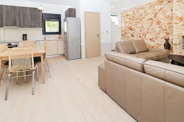 Aspri Petra Villa (110m2) ima 3 spavaće sobe i može da primi do 7 osoba (ili 6 odraslih i 2 dece na zahtev). Vila se prostire na dva nivoa: prizemlje i prvi sprat.