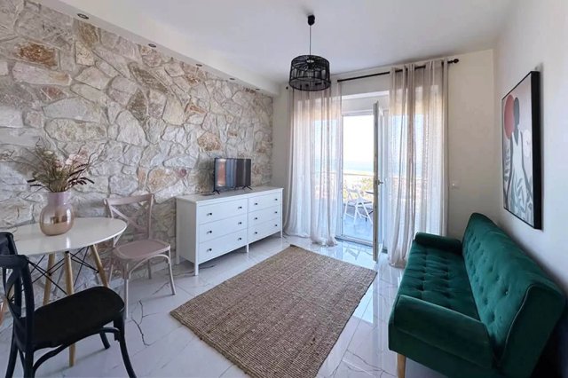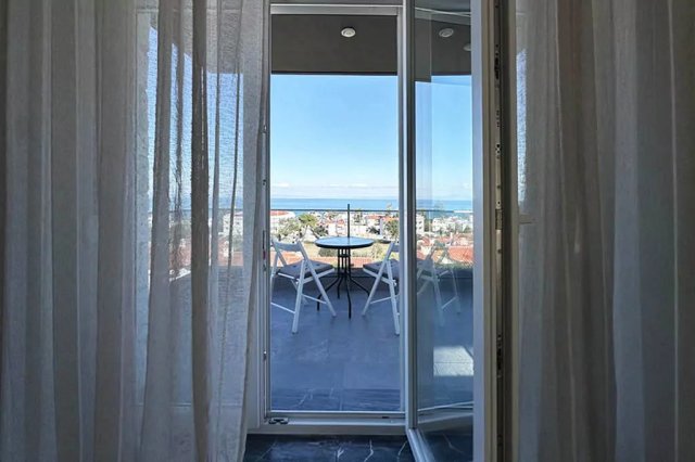 Svaki apartman ima terasu sa stolom, stolicama, i pogledom na mesto i more u daljini.