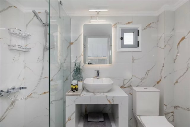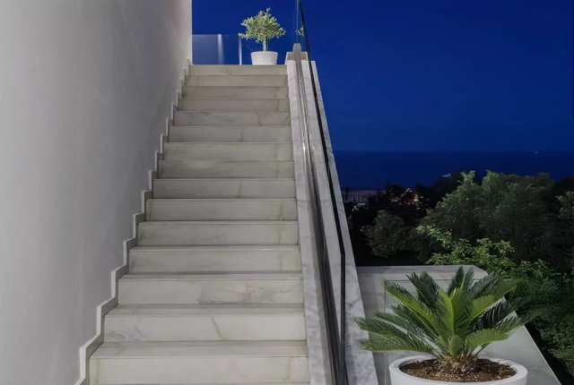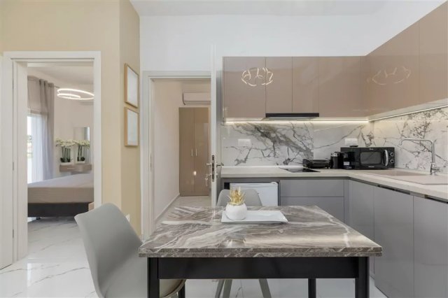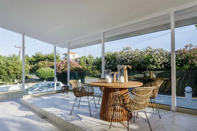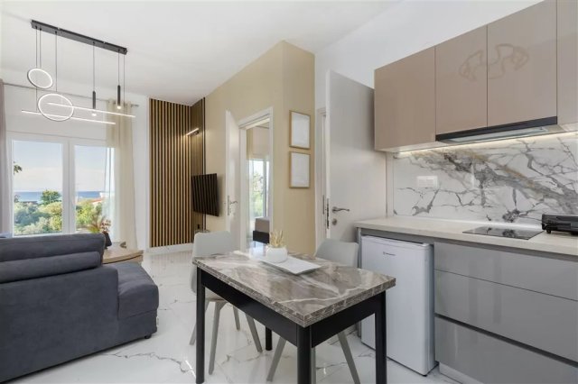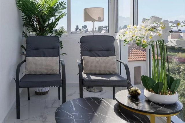 Svaki apartman ima prostranu terasu sa spoljnim prostorom za sedenje i ručavanje. Pogled se pruža na vrt, bazen, i more.