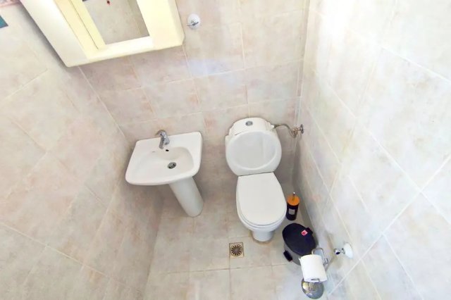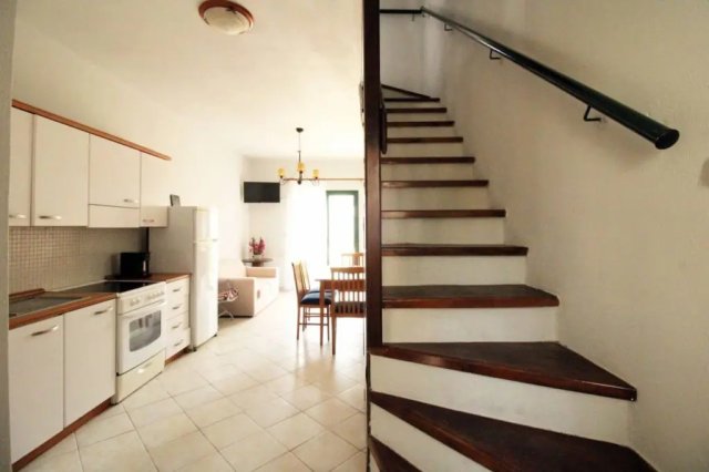 U prizemlju se nalazi dnevna soba sa duplom sofom na razvlačenje i klima-uređajem. Unutar ove prostorije nalaze se i trpezarija (sa stolom i stolicama) i veoma dobro opremljena kuhinja - poseduje veliki frižider, rernu, šporet i kuvalo za vodu. Iz ove prostorije se izlazi na terasu opremljenu spoljnim nameštajem. Prizemlje ima i jedan toalet u kome se nalaze WC šolja i lavabo.